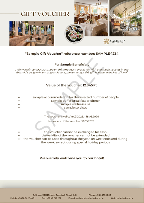The voucher can be redeemed for any service at the Calimbra Wellness and Conference Hotel in Miskolctapolca.